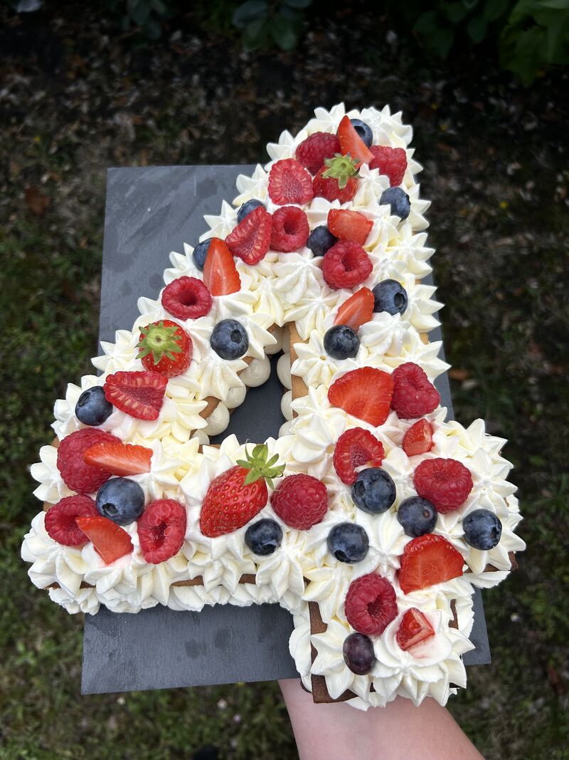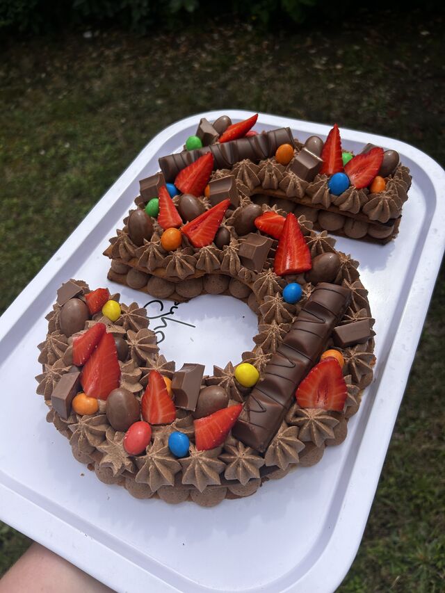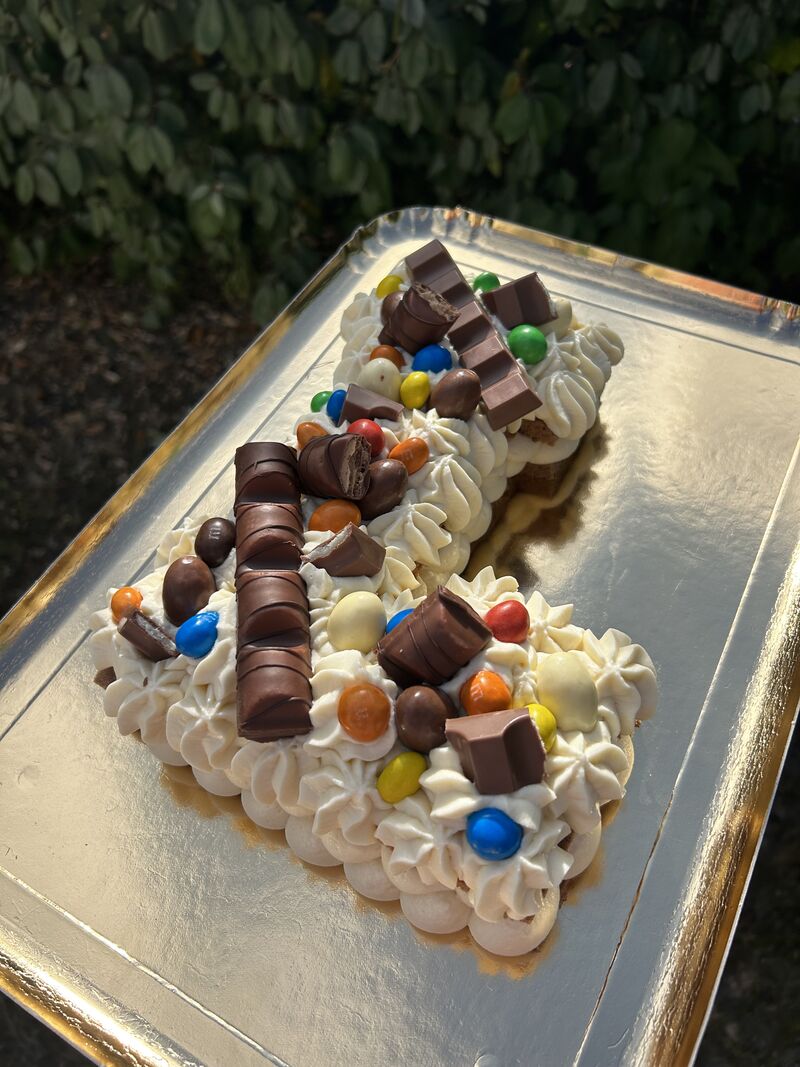 "L", génoise chocolat, chantilly vanille et décorations en chocolat
